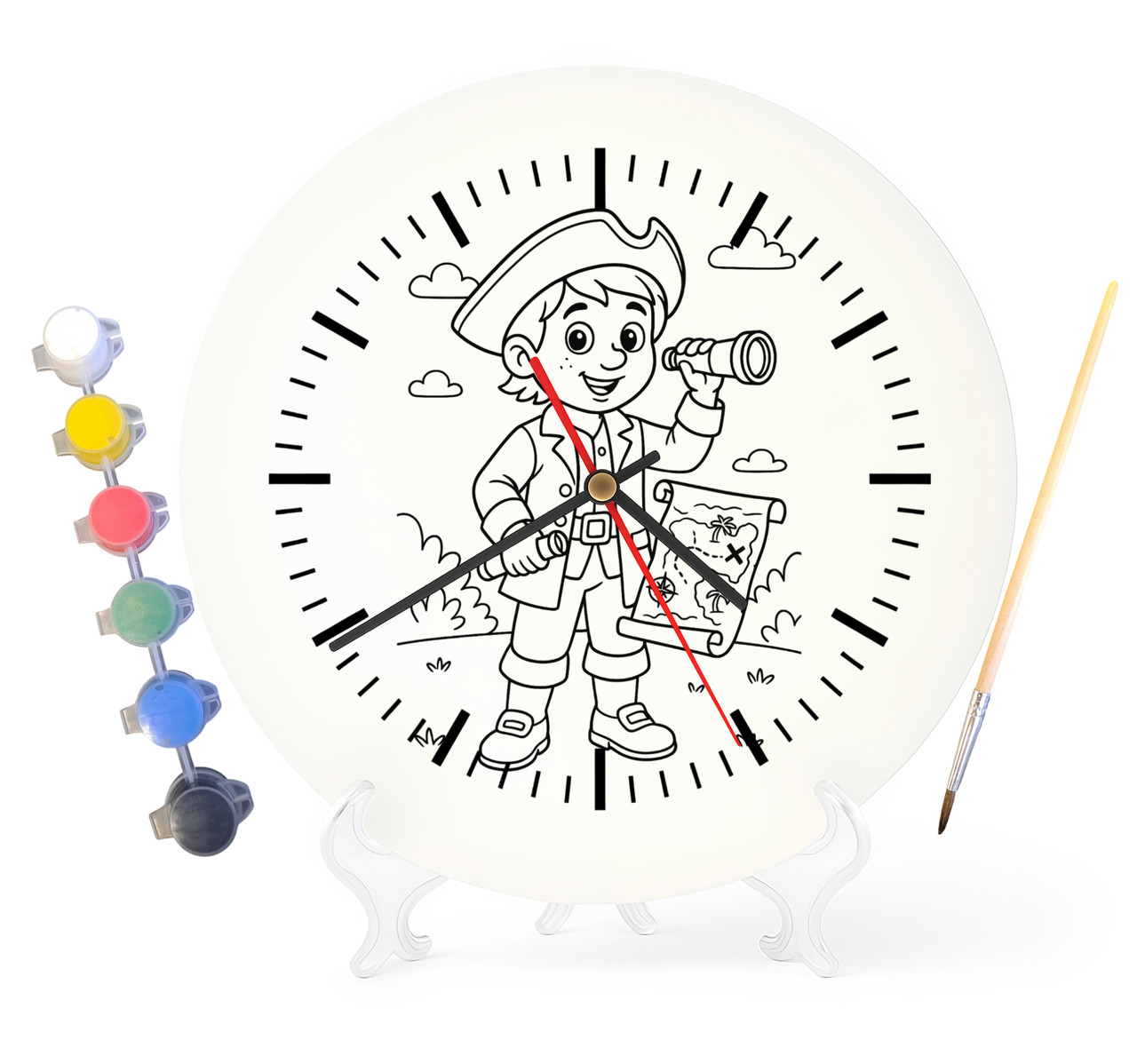 Подаруйте дитині захопливий творчий досвід і корисний декор для кімнати! Годинник-розмальовка (Тип: настінний/настільний (із підставкою) поєднує розвагу й практичність: малюк розмальовує сюжет за контурами, самостійно підписує цифри на циферблаті, а готовий годинник можна повісити на стіну або поставити на прозору підставку — зручно і для оформлення кімнати, і під час розмальовування.